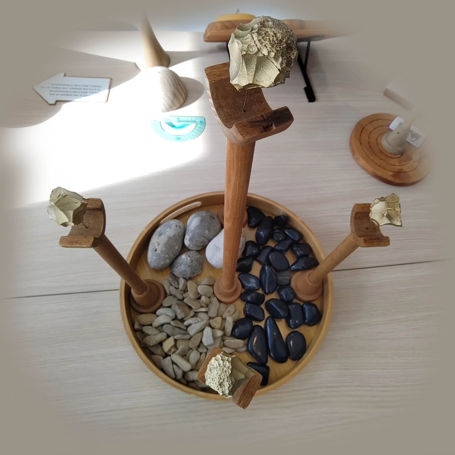 Research at the Laboratoire de Mathématiques d'Orsay on stochastic geometry led to the creation of jewellery pieces. They are shaped like cells of ideal Poisson-Voronoi tessellations in three-dimensional hyperbolic space. The installation pursues a dual objective: showcasing these mathematical jewels, and making modern abstract mathematics accessible to the general public in an intuitive way.